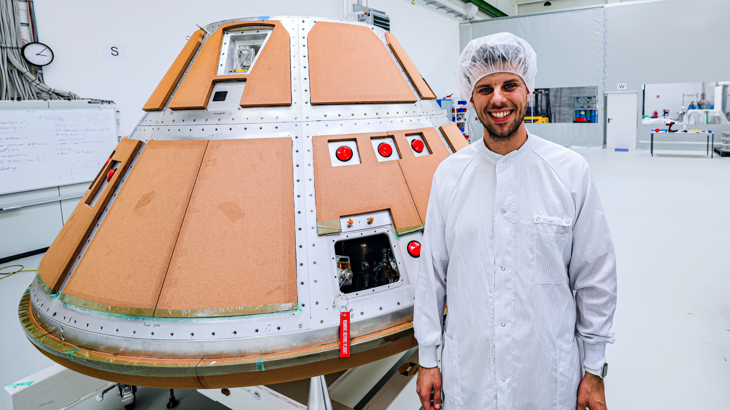 Die Hülle des Raumfahrzeugs ist beige – und nicht etwas metallisch oder lackiert. „Das ist eine Korkverbindung, dem Kork in Birkenstock-Schuhen gar nicht so unähnlich ist“, erklärt Maximilian Strixner. „Das Material ist sehr gut für die Hitze beim Wiedereintritt in die Atmosphäre geeignet, weil er sich dabei kontinuierlich abbaut, wodurch sich eine Plasmaschicht bildet, die sich um die Kapsel als Schutzglocke legt. Das nennt sich ein ablatives Hitzeschild.“ Am Hitzeschild wird eine Temperatur von bis zu 3.000 Grad Celsius erwartet, die Temperatur innerhalb der Kapsel soll dennoch bei 40 Grad Celsius bleiben. Das alles muss die Kapsel, die ansonsten vor allem aus Aluminium besteht, aushalten. Abgesehen von den minus 150 Grad in All.