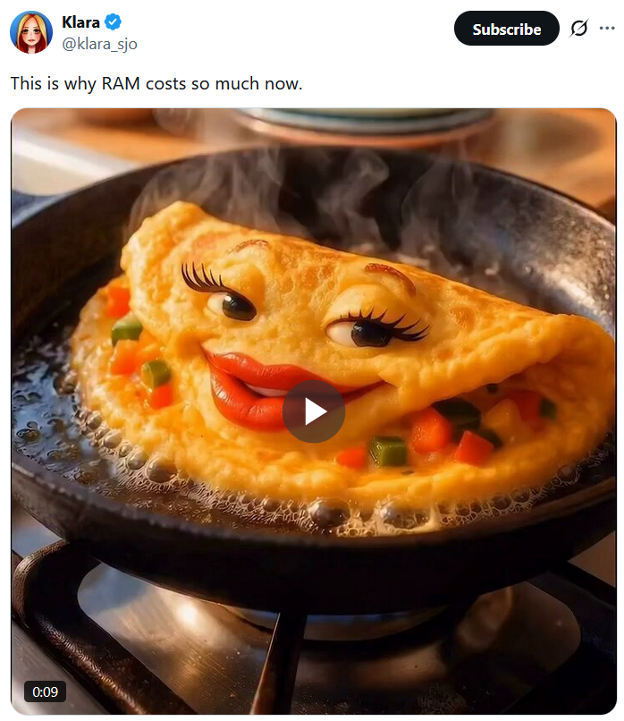 Eng mit dem slop verbunden ist ein weiteres, sehr konkretes Problem, das sich bereits zum Meme entwickelt hat: Jemand postet ein absurdes KI-generiertes Bild oder Video. Darüber oder darauf steht der Text: „This is why RAM costs as much as a car”. Denn seit 2025 haben sich die Preise insbesondere für Arbeitsspeicher vervielfacht. Ein 16-GB-DDR5-Modul lag im August 2025 im Schnitt bei rund 45 Euro; inzwischen werden teils 160 Euro aufgerufen. Einzelne Hersteller hoben die Preise sogar um bis zu 500 Prozent an. Und die Preiserhöhungen könnten sogar noch extremer werden. Der Grund? Die massive Nachfrage von KI- und Cloud-Unternehmen, die Produktionskapazitäten für ihre Rechenzentren binden.